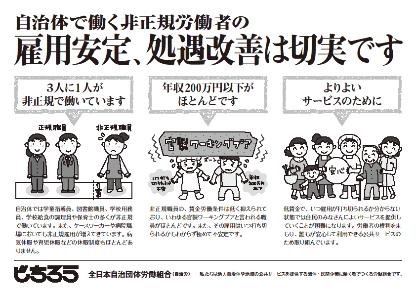 今や自治体職員の3人に1人が臨時・非常勤等職員となっている。臨時・非常勤等職員は、行政サービスの提供において重要な役割を担っているが、法の谷間に置かれ、雇用は細切れで、待遇は低位におかれている。自治労は今春闘で、恒常的業務に就く臨時・非常勤等職員の雇用継続や正規職員への転換、賃金・諸手当等における均等待遇の必要性を訴えている。雇用改善、格差是正の運動を職場の仲間が全員で取り組もう。