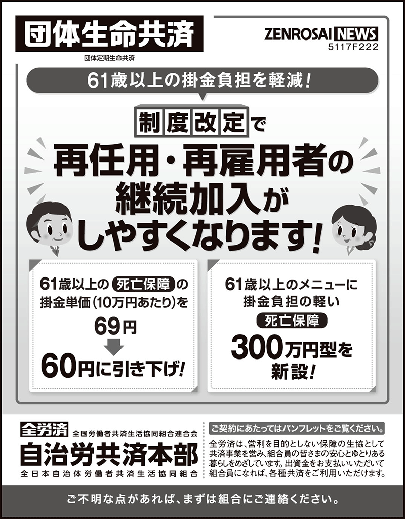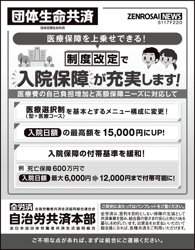 全労済自治労共済京都府支部では現在、2019年4月発効の「じちろうセット共済」を一斉募集中だ。充実した医療保障の団体生命共済や、退職後の保障のための長期共済、税制適格年金などの新規加入や継続募集は、年に1度のこの機会のみ。ぜひこの機会に保障の点検・見直しをお願いしたい。