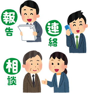 「報連相」とは、「上司からの指示に対して経過や結果を知らせる」、「知らせた方がいいと判断した情報を関係者に伝える」、「判断に迷う時や他人の意見が欲しいときにアドバイスを仰ぐ」こと。
